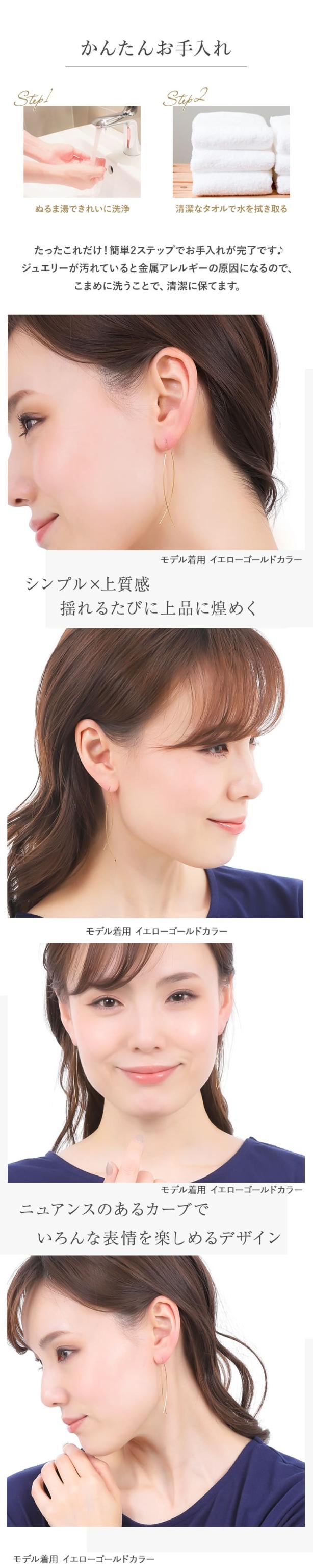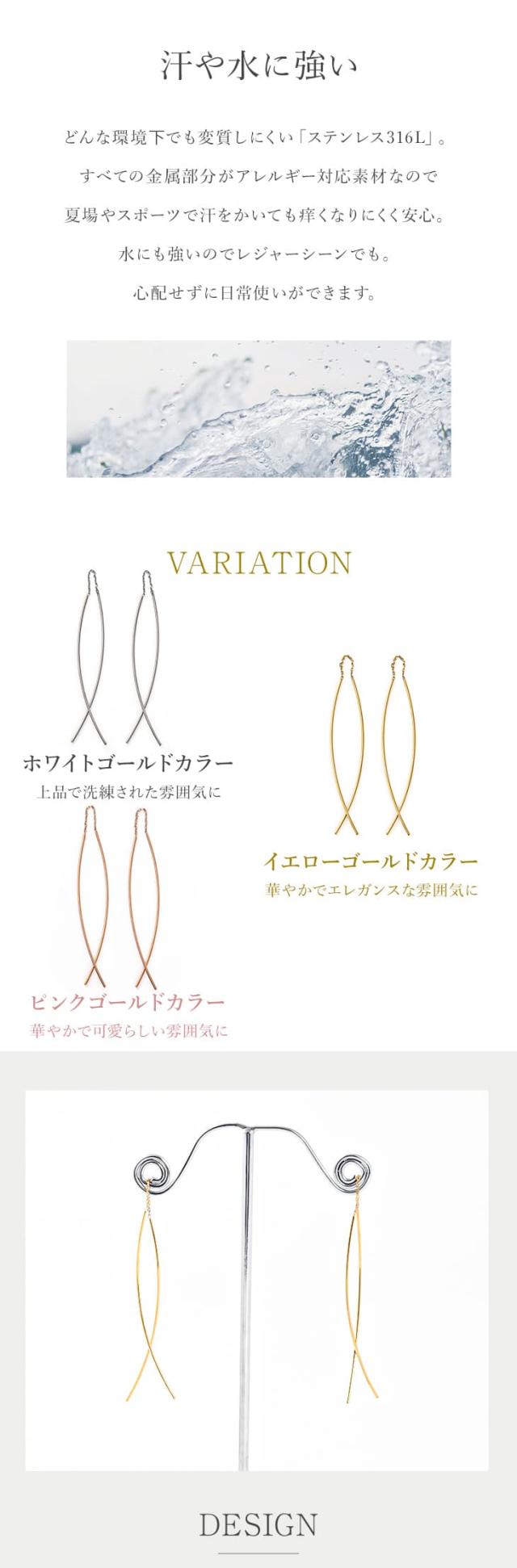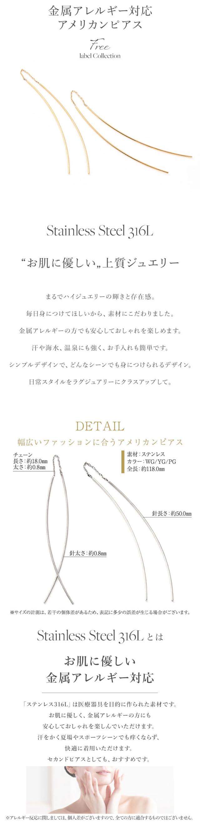 「 アメリカンピアス 」はカジュアルにもフォーマルにも使える人気の耳飾り。前後の長さを変えてアシンメトリーに装っても♪華奢で上品なロングピアスはオフィスや通勤はもちろん、リモートワークのときに、お顔周りを華やかに見せてくれます。「 ステンレス 316L 」は金属アレルギーに対応しているので、お肌に優しく安心です。