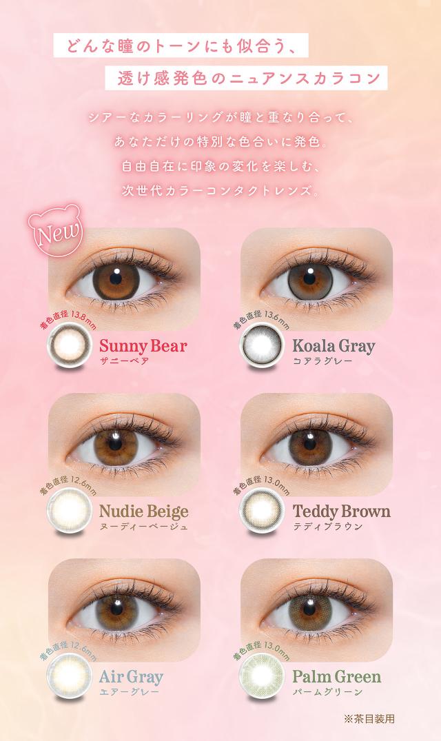 ヌーディーベージュ、テディブラウン、エアーグレー、パームグリーン