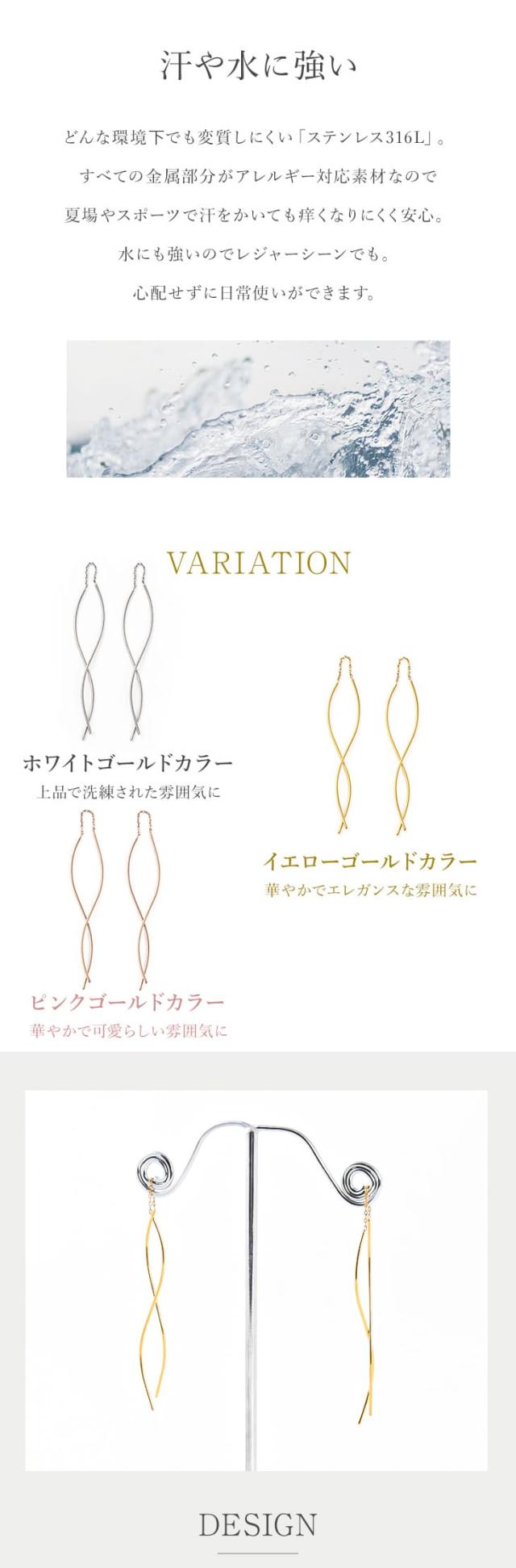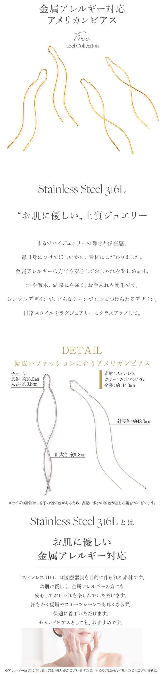 「 アメリカンピアス 」はカジュアルにもフォーマルにも使える人気の耳飾り。前後の長さを変えてアシンメトリーに装っても♪華奢で上品なロングピアスはオフィスや通勤はもちろん、リモートワークのときに、お顔周りを華やかに見せてくれます。「 ステンレス 316L 」は金属アレルギーに対応しているので、お肌に優しく安心です。