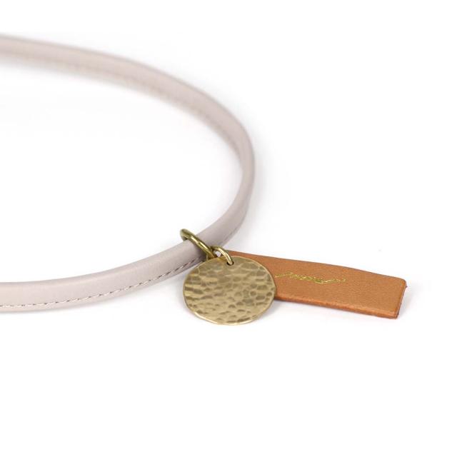 長方形のレザータグと、真鍮を金槌で何度も叩き模様をつけた、槌目模様の丸いチャームがアクセントに。