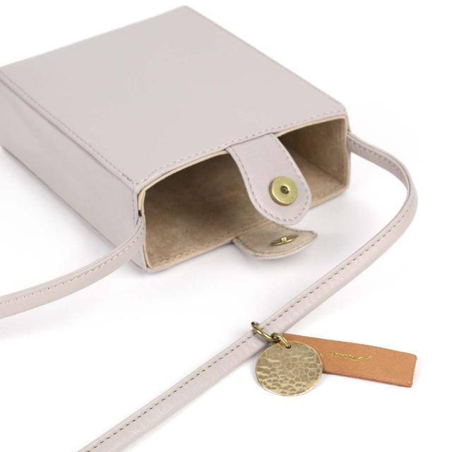 肌になじむしっとりとした触感のレザーを使用した、ミニマルな箱型のショルダーバッグ。