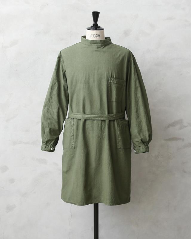 ロシア軍でガウンとして採用されていたアイテムが入荷しました。元々ホワイトだったのですが、染め職人に丁寧にOD染めしていただきました。 ODにする事でかなり良い雰囲気になり、着込むことでさらに風合いの増す1着です。本来は後ろで紐を留めて着用されていましたが、後ろ前どちらでも着用可能な仕様となっています。肌触りの良いネップ感のある平織りのコットン素材を使用した風合いの良い仕上がり。製造された年代やメーカーの違いで様々な仕様がありますが、こちらは紐を結んで開閉し、サイドで縫われたウエストベルト、袖先はボタン留めの仕様になっています。