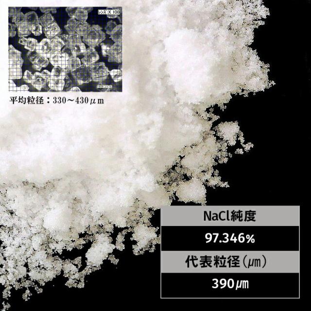 | 詳 細 | 水分 1.317% Ca(カルシウム) 0.046% Mg(マグネシウム) 0.080% K(カリウム) 0.128% NaCl(塩化ナトリウム) 97.346% 平均粒径 390μm(マイクロメートル) 製品特性 立方体の結晶性粉末、白色、無着色、無添加 |