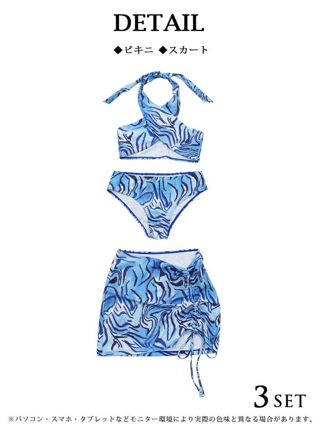 ☆気になるお腹周りやヒップラインの体型カバーをしてくれる3点セットビキニはスカートの裾がしぼれるので好みの長さに調整が効き脚長効果ももたらすレディースビキニ♪