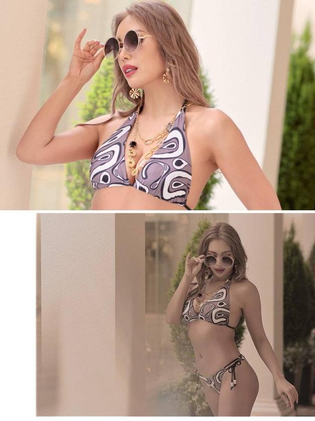 ☆グレーブラウンのサイケデリック柄の水着は大人ぽく海外セレブ風な印象を与えてくれるビキニセットです♪