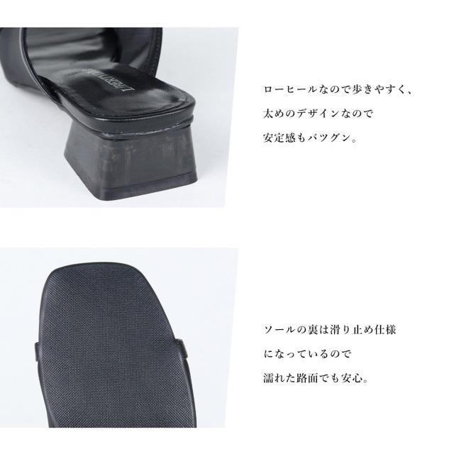 安定感のある太ヒールを採用し、歩きやすさとスタイルアップ効果を両立。