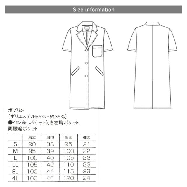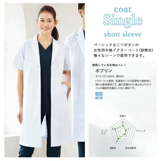 ベーシックな三つポタンの女性用半袖ドクターコート。