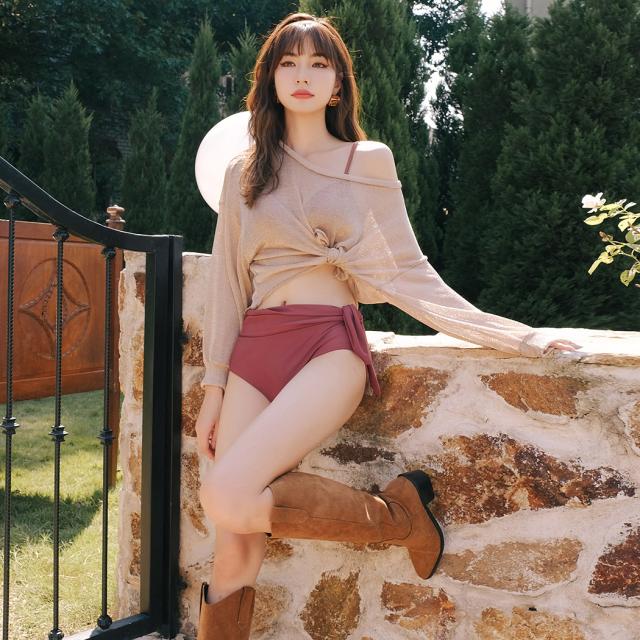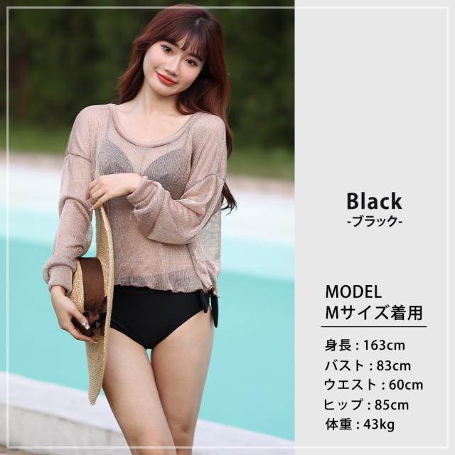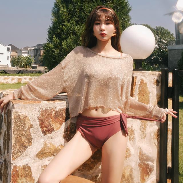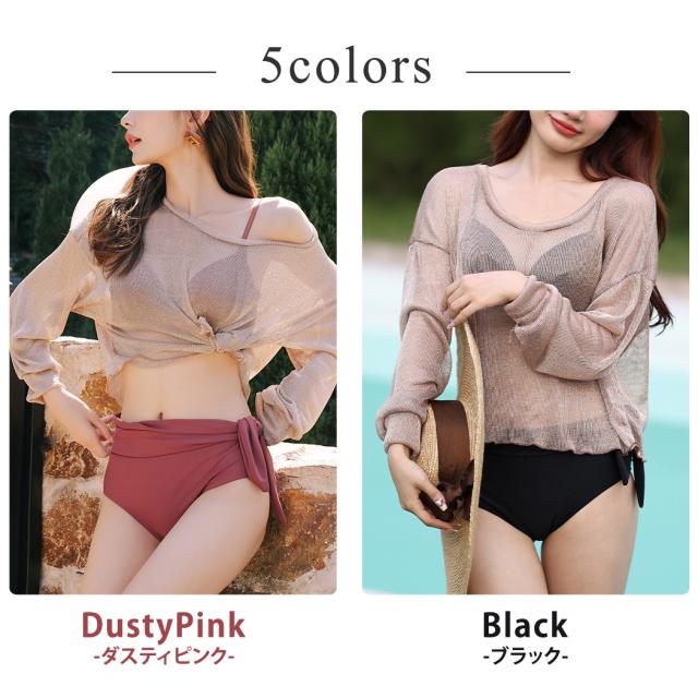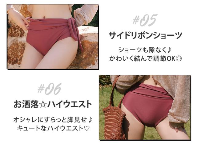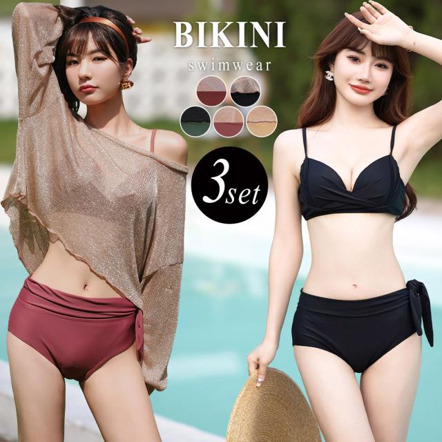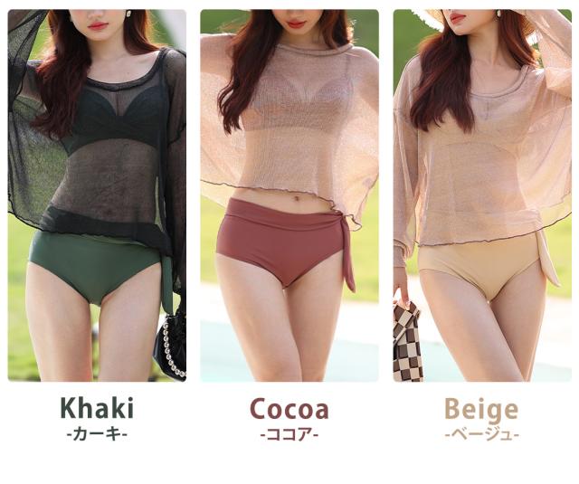 即納 水着 レディース ビキニ 体型カバー 長袖 トップス 大人 可愛い シンプル ハイウエストショーツ 2way 3点セット トップス付き 日焼け対策 夏 くすみカラー サイドリボン クロスバンド バスト 盛れる 二の腕 ウエスト カバーアップ