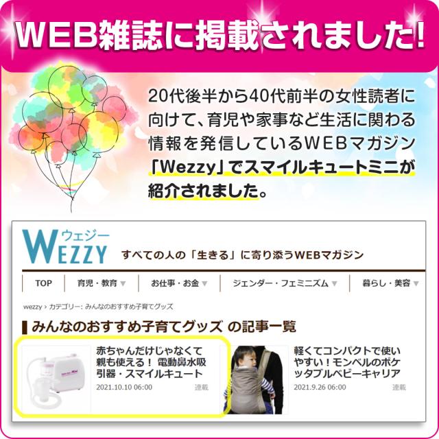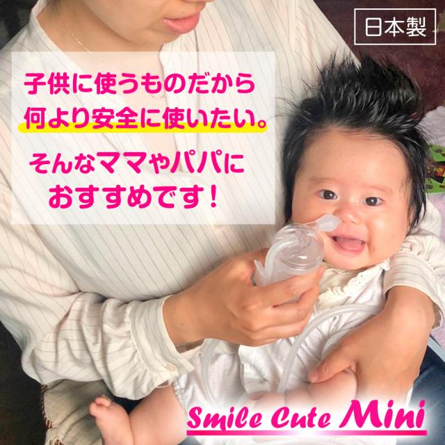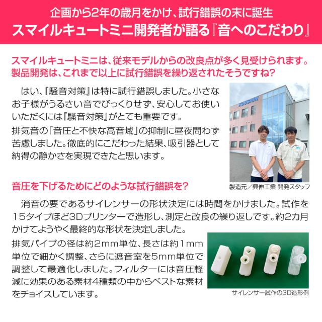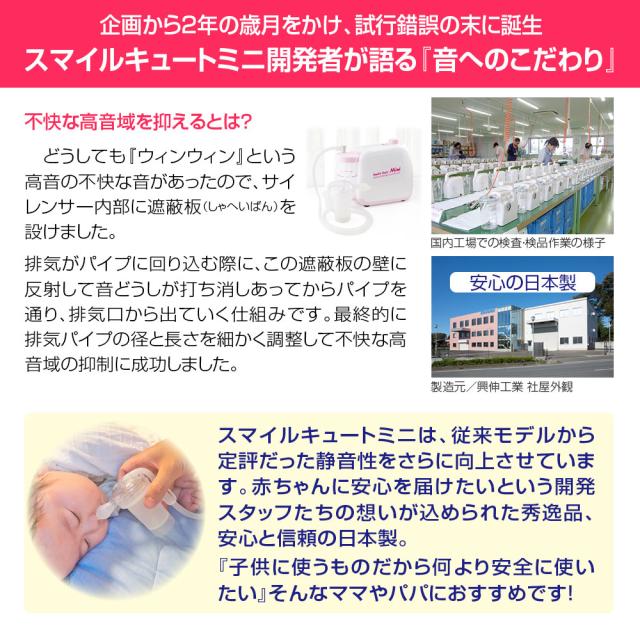 スマイルキュートミニは、日本の技術者が使いやすさにとことんこだわって、検討に検討を重ねて開発した電動鼻水吸引器です。