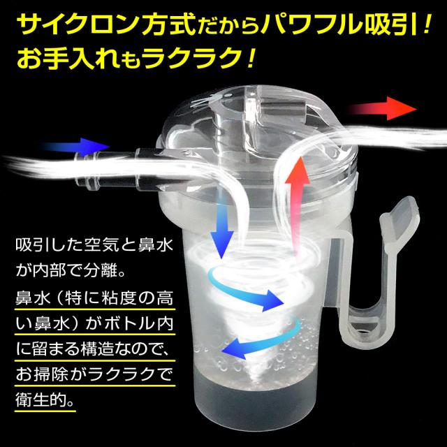 ◆パワフルなサイクロン吸引方式を採用したことで、鼻水は吸引キットのボトル内に溜まります。