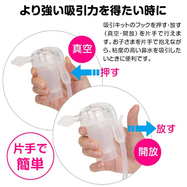 ◆鼻水吸引キットは片手で吸引・開放操作ができて持ちやすく、メンテナンスがしやすい設計。