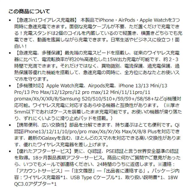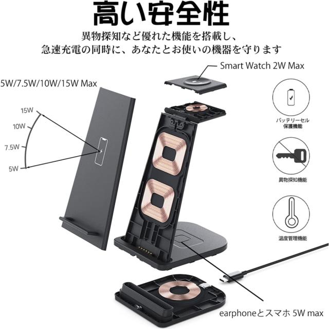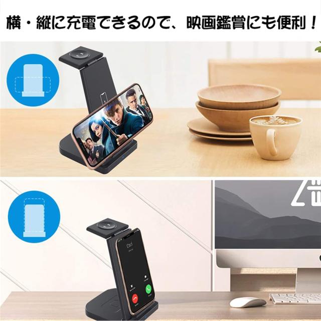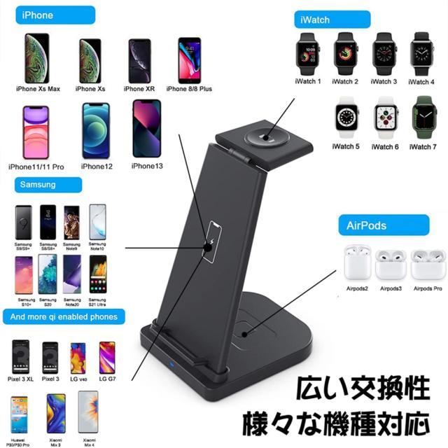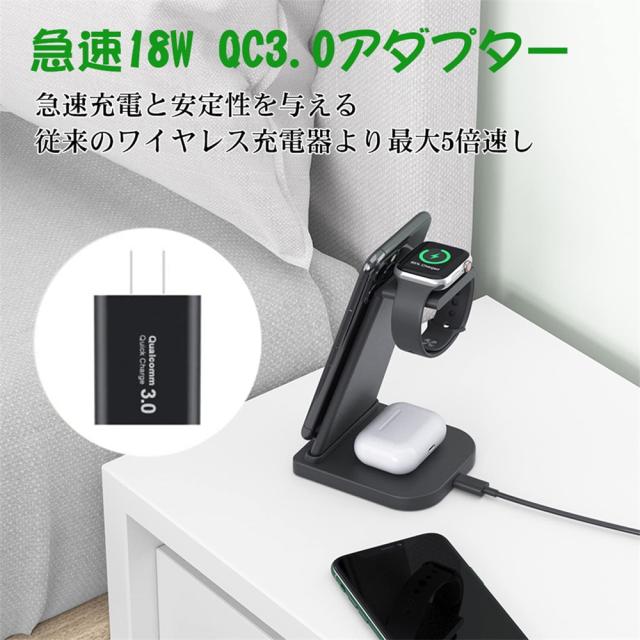 ワイヤレス充電器 充電スタンド Qi認証 3 in 1急速充電15W/10W/7.5W Apple Watch充電器 Apple Watch 7/6/SE/5/4/3、Airpods 2/3/Pro、iPhone 13/13 Mini/13 Pro/13 Pro Max/iPhone 12/11/X/8 などQi機種に対応
