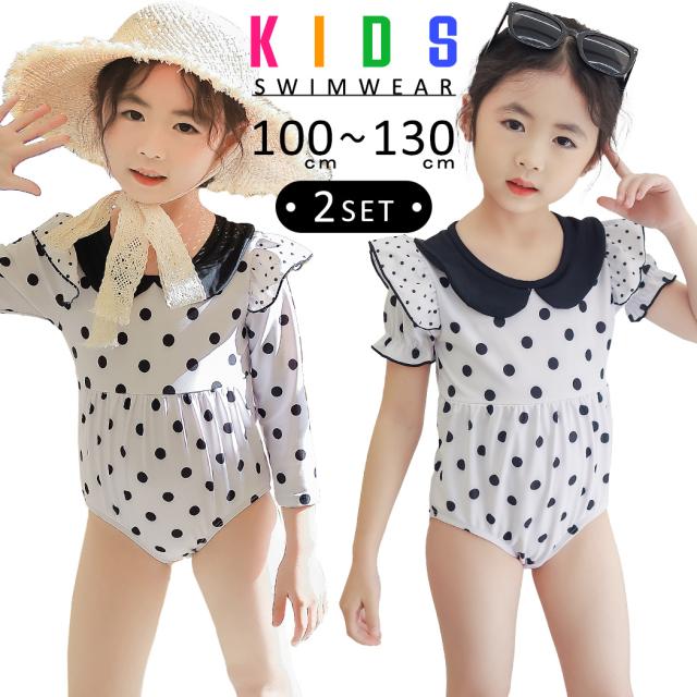 即納 キッズ 水着 女の子 ワンピース スイムキャップ 2点セット 長袖 半袖 2タイプ プール ビーチ 子供 ベビー ジュニア 100cm 110cm 120cm 130cm かわいい おしゃれ フリル オールインワン 幼稚園 保育園 小学生 ドット柄 露出控えめ 水泳教室 ワンピ水着 ワンカラー