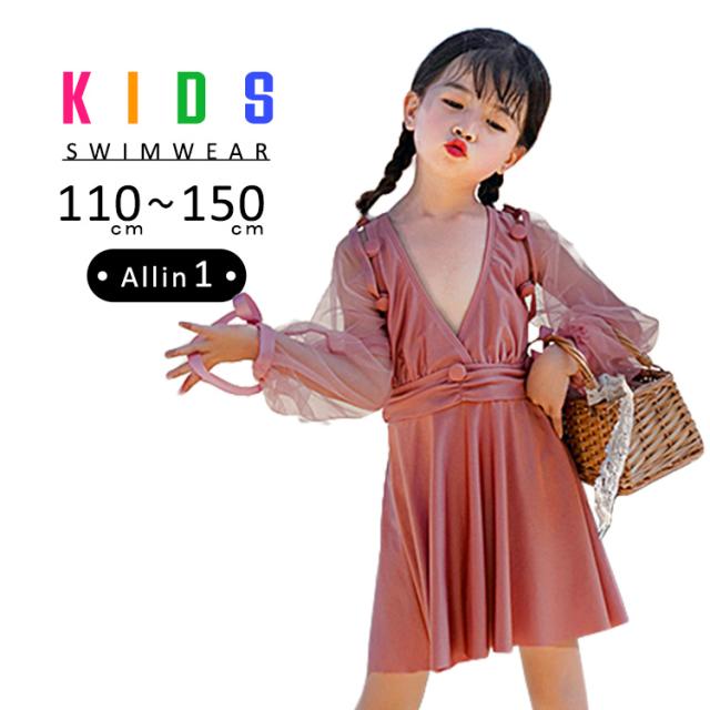 即納 キッズ 水着 女の子 ワンピース かわいい おしゃれ 子供 ベビー ジュニア オールインワン 2way 長袖 ボタン 取り外し可能 ノースリーブ シースルースリーブ リボン バックシャン 110cm 120cm 130cm 140cm 150cm 海 プール 旅行 リゾート 水遊び 水泳 小学生