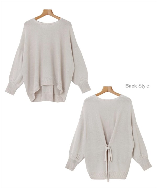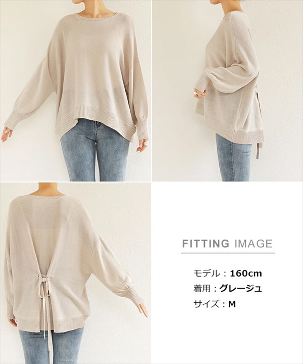 送料無料 背中リボン 天竺編み リネンタッチ アクリル 長袖 ニットトップス レディース ラウンドネック ギャザー袖 体型カバー カジュアル シンプル 上品 春 秋 オフィスカジュアル かわいい お出かけ デート 楽ちん ゆったり Ladies 20代 30代 40代