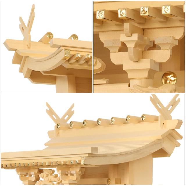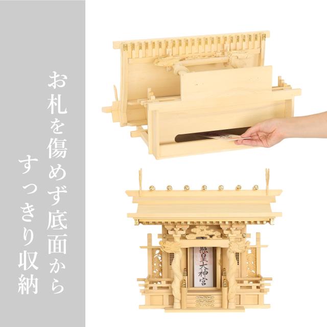 神社から頂いた様々な大きさのお神札は、底面から差し入れる収めやすい構造です。神棚本体は、一般のご家庭から店舗、事務所、会社の応接間などに適した、立派で大きめのサイズ感です。