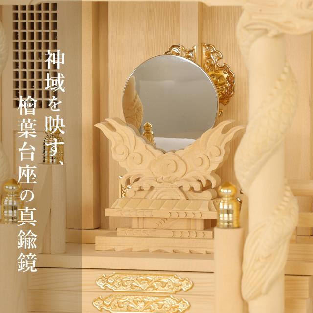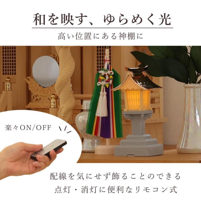 表面をパール調に加工した、希少な神具セット7点に、榊の葉の部分に生絹を使用した真榊一対が付属。LED灯篭の灯りは本物の炎を再現する「ゆらぎ」機能付き。リモコン(電池式)で簡単に操作できます。檜葉製の台座に真鍮鏡(本鏡)を乗せた、神社と同じ作りの神鏡も付属します。