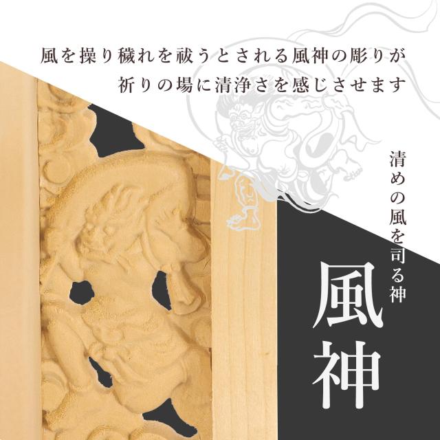 風神雷神と双龍の彫刻、天界の神々をイメージした美しく壮大なお社です。桧ではなく、年輪・木目がほとんど無い淡い単色のヒバ材で作られたお社。清楚で上品、工芸品のような趣き。