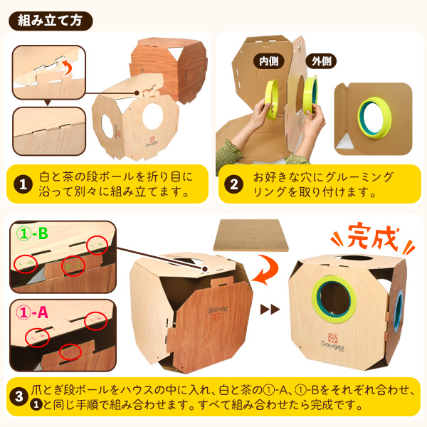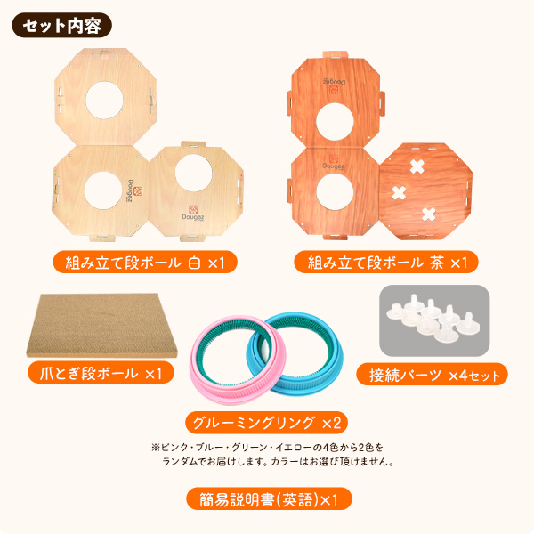 【セット内容】 組み立て段ボール白×1/組み立て段ボール茶×1/爪とぎ段ボール×1/接続パーツ×4セット/簡易説明書(英語)×1/グルーミングリング×2