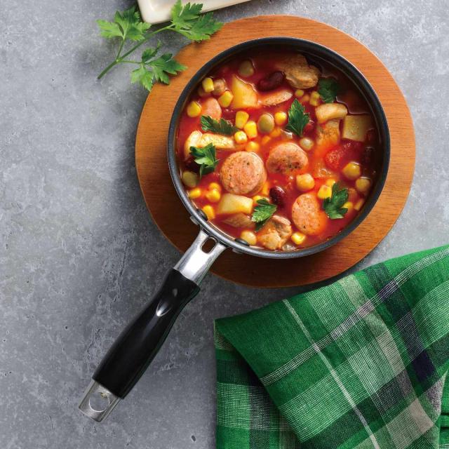 熱の伝わりが良いアルミと丈夫なステンレスの2層鋼の14cmのフライパンです。コンパクトなサイズですが、IH・ガス火両方に対応しています。朝食作りや副菜などのちょっとしたお料理にちょうどいいミニサイズです。