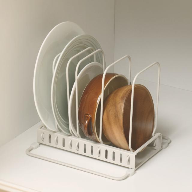 シンク下のスペースを有効活用してお皿を取り出しやすく収納できるディッシュスタンド。自由に幅を変えられるので、お皿の深さや大きさがバラバラでも収納することができます。幅の調節は道具不要で簡単。また、重ねずに収納できるので、お皿が傷つきにくいです。
