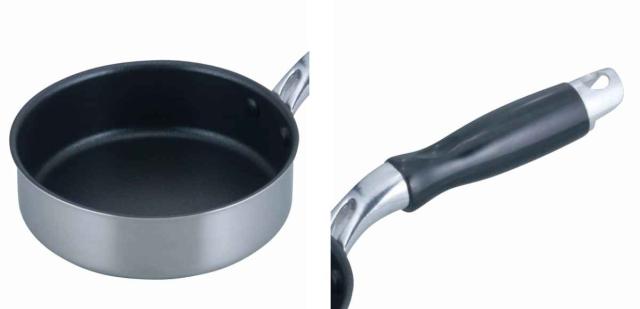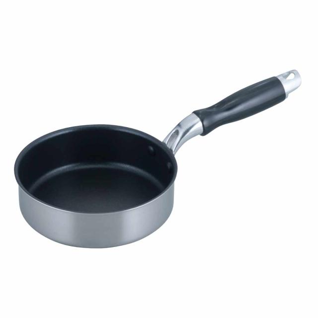 熱の伝わりが良いアルミと丈夫なステンレスの2層鋼の16cmのフライパンです。コンパクトなサイズですが、IH・ガス火両方に対応しています。朝食作りや副菜などのちょっとしたお料理にちょうどいいコンパクトサイズです。