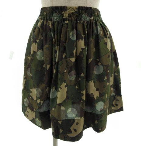 【中古】MARC by MARC JACOBS スカート ミニ フレア 総柄 シルク100% ウエストゴム カーキ 茶 ベージュ 緑 XS
