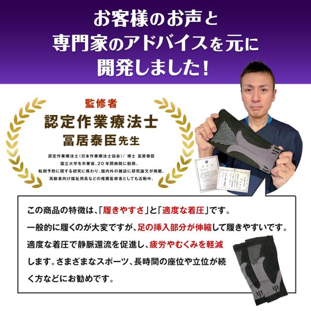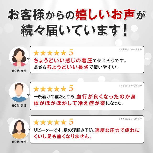 - 毎日使用してるのでお気に入りです。着用していると足が楽なので立ち仕事の自分には必須です。 締め付け具合がちょうどいいので痛くなったりしないのがいいですね。生地はしっかりしていて型崩れもないと思います。