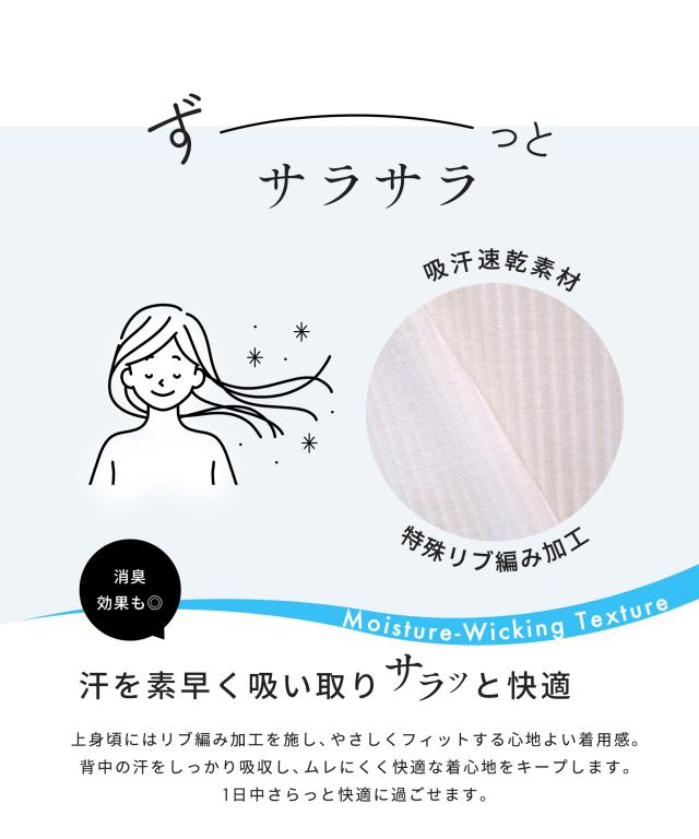 伸縮性に優れたリブ編み加工により、お肌に触れる部分が凹凸でさらっとした着心地に。