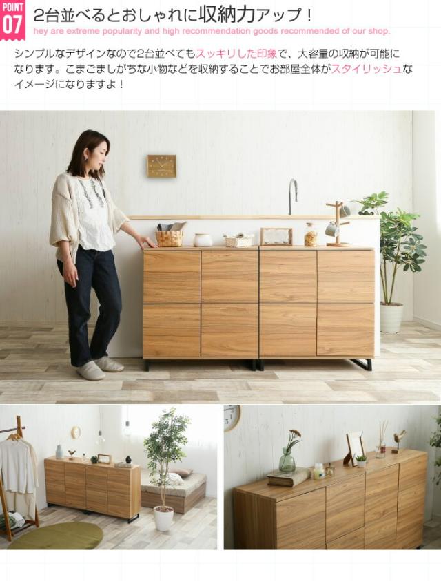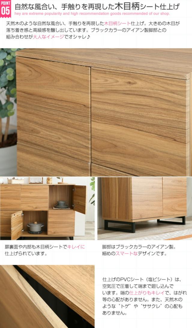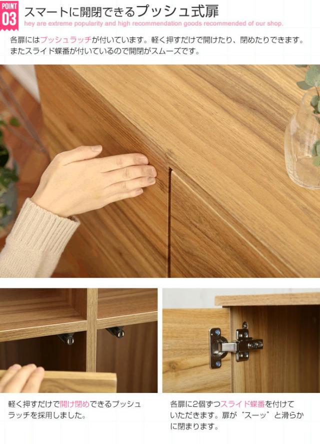取っ手のないフラットな扉、美しい木目柄は圧迫感を与えません。 おしゃれなリビングボードです。