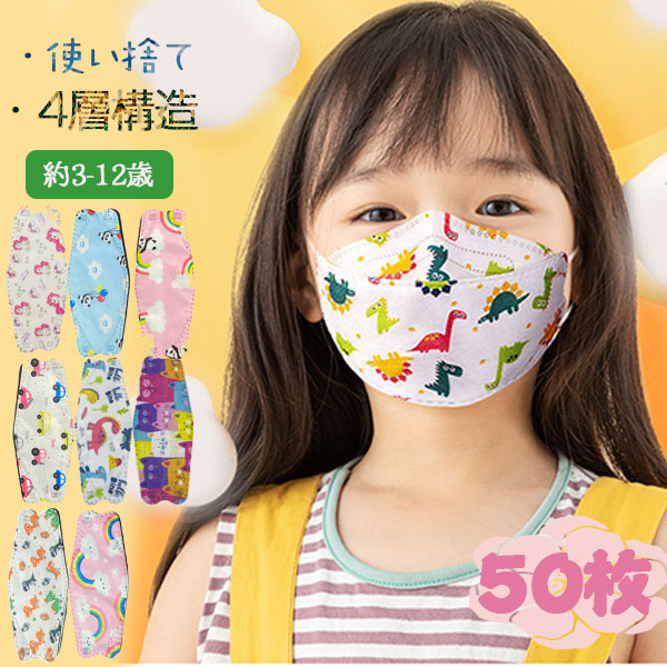 クーポン KF94 マスク 子供用 50枚入り 使い捨て キャラクター 4層構造 可愛い 立体マスク 動物柄 不織布 小さめ おしゃれ 柄マスク KN95相当