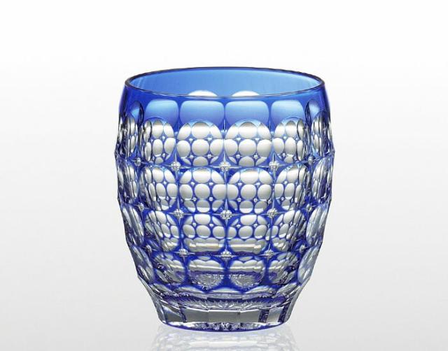 やわらかいフォルムの鮮やかな青被せクリスタルガラスに、連結した玉をカットしていくことで紫陽花を感じさせます。上面からグラスを覗くと細かく刻まれた底面の菊紋様と、カットガラスの美しさを存分にお楽しみいただけます。