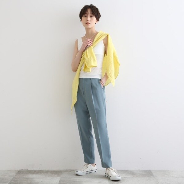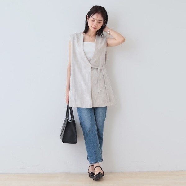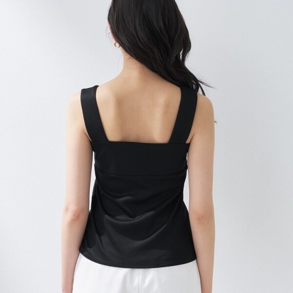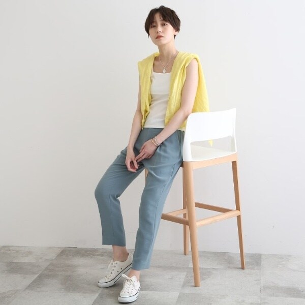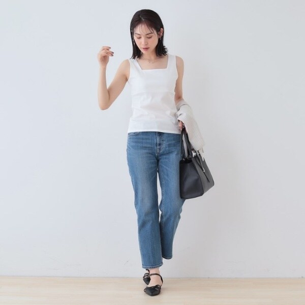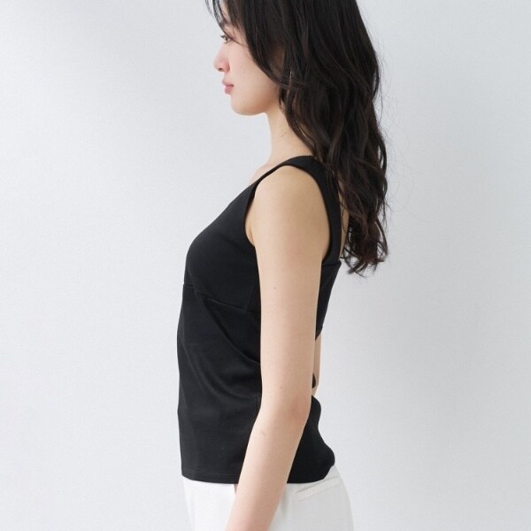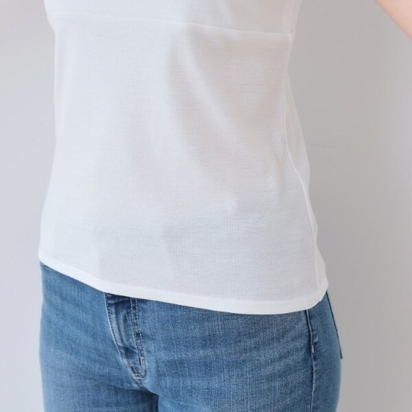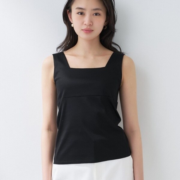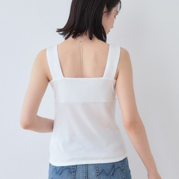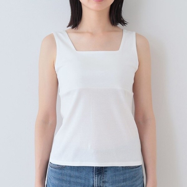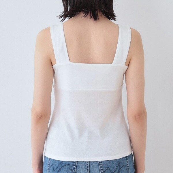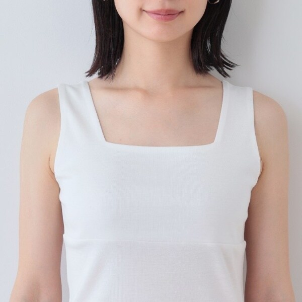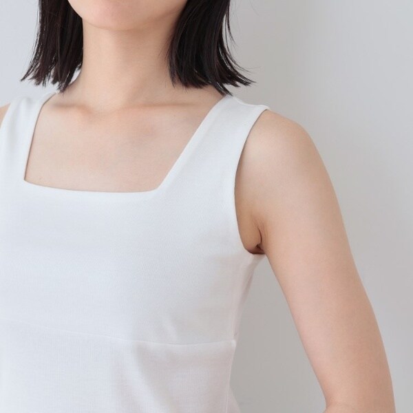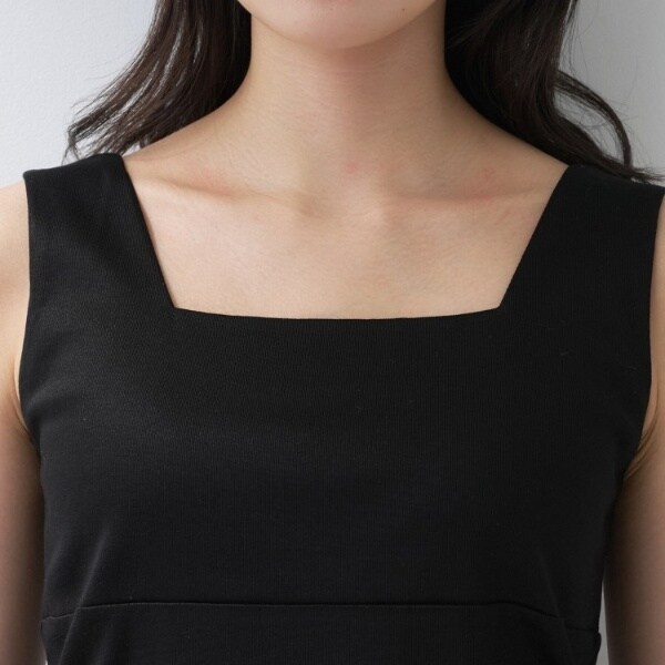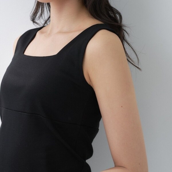 ビスチェのように胸元をスクエアにすることで衿元からのインナー見えを防ぎ安心感あるデザインに。