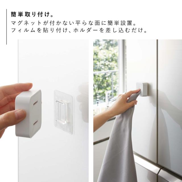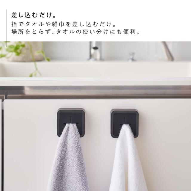 タオルを指で差し込むだけのタオルホルダー、フィルムフックで簡単取付!シンク扉やキッチンパネルなど、マグネットが付かない平らな面に簡単設置。