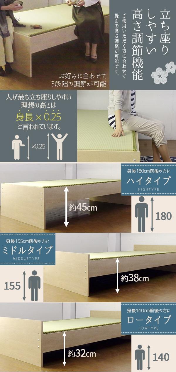 畳面までの高さを約45cm、38cm、32cm3段階の高さ調節が出来るようになっており、ご使用する方に合わせた高さに調節が可能です。