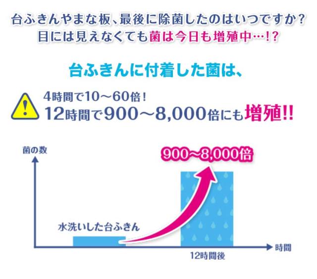 水洗い後の乾いた台ふきんにスプレーする(10*10cmあたり表裏1回ずつスプレー)。その後の洗い流しは不要。