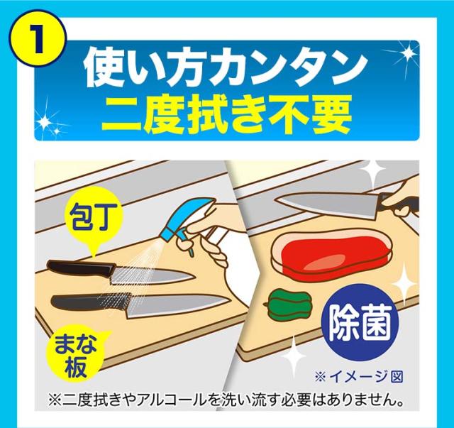 ●簡単、強力除菌*!キッチン掃除用品。調理台・冷蔵庫の中や外側・電子レンジ等のキッチン家電の外側はもちろん、食卓やテーブル、ドアノブの除菌*も。