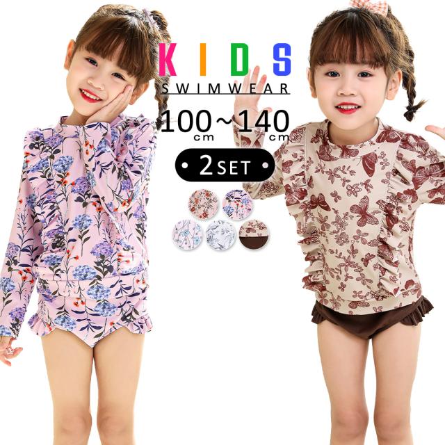 即納 キッズ 水着 女の子 かわいい 2点セット トップス ショーツ おしゃれ 子供 ベビー ジュニア 長袖 総柄 はしごフリル 日焼け対策 背中 しずく型 金属ホック セパレート 100cm 110cm 120cm 130cm 140cm 水遊び プール 水泳 海 川 露出控えめ