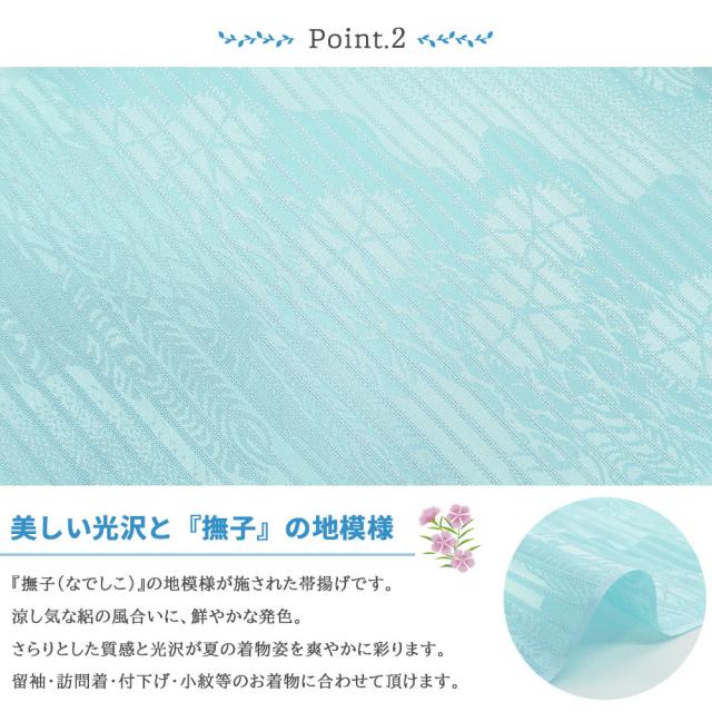 夏の定番、絽生地の帯揚げには、美しい撫子の地模様を施しました。