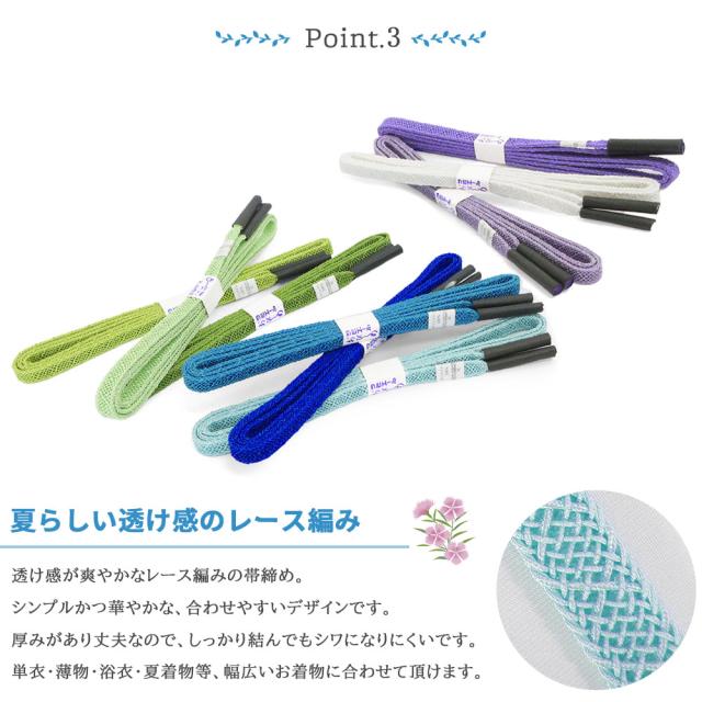 透け感が爽やかなレース編みの帯締めは、厚みがあり丈夫なのでシワになりにくい優れもの。