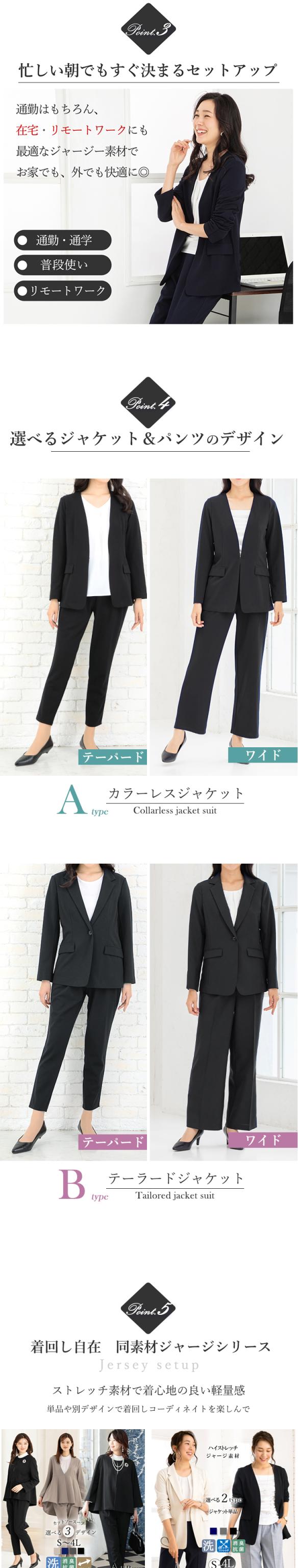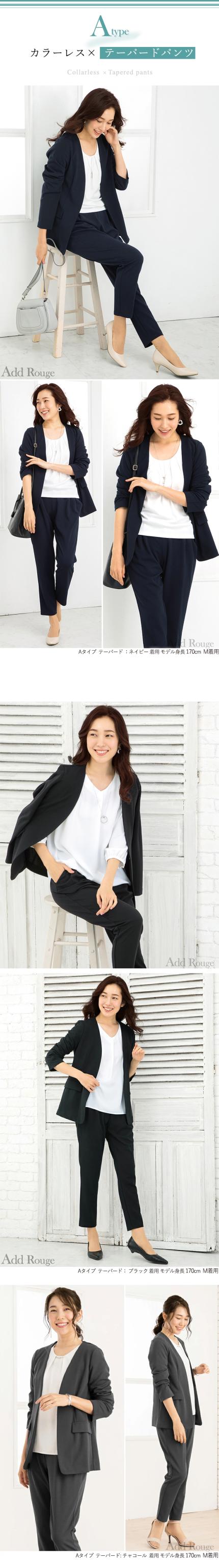 ジャケットはテーラードジャケットとカラーレスジャケットから選べ、裏地がないためカーディガン感覚で羽織れます。