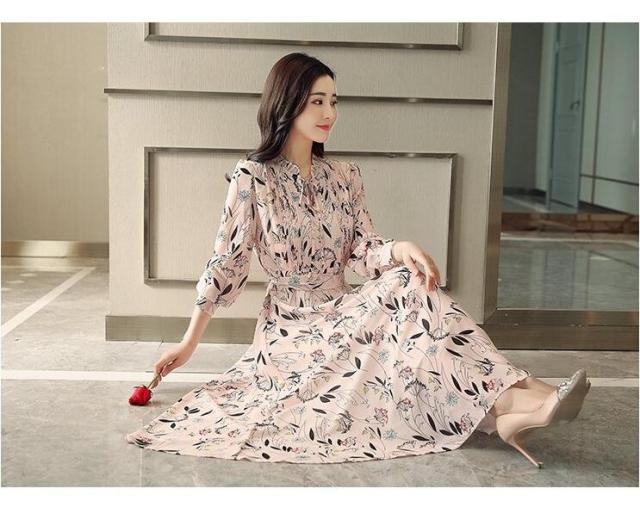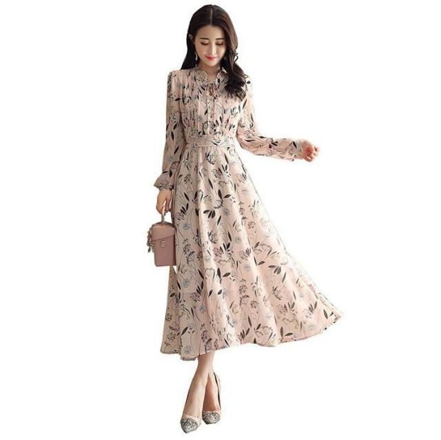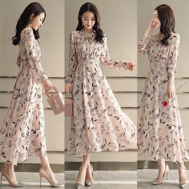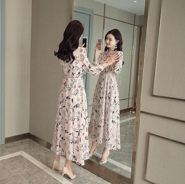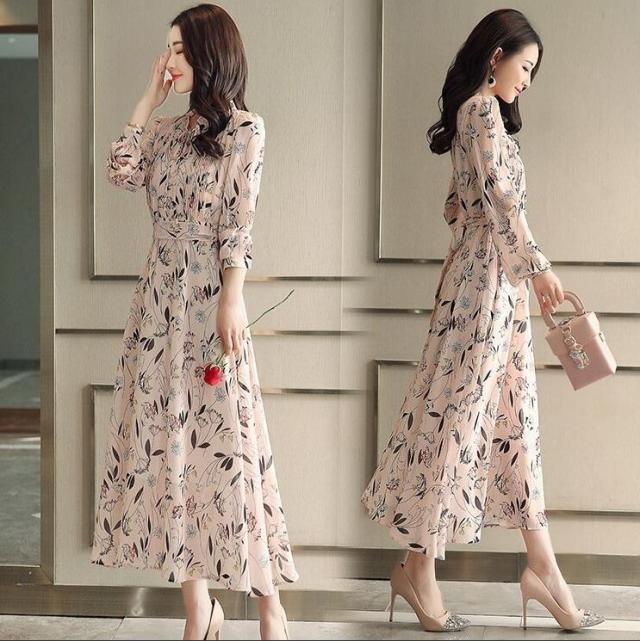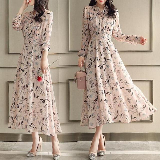 ワンピース レディース きれいめ マキシワンピース 春夏新作 長袖ワンピース 花柄シフォン フレアスカート オシャレ韓国風