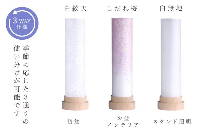 初盆の年は「白紋天」を、その後のお盆では「しだれ桜」の絵柄シートを使い、美しくお盆の明かりを灯します。絵柄シートを外せば「白無地」の和紙風行灯に。仏壇周りや普段使いのインテリア照明としてやさしく、温かく灯すことができます。