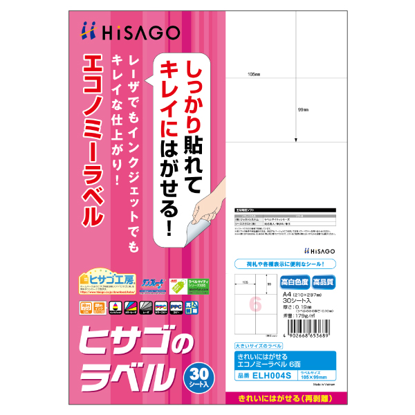 【メール便発送】ヒサゴ きれいにはがせるエコノミーラベル A4 6面 30シート入 ELH004S