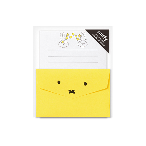 ミッフィーをワンポイントにあしらった、小さくてもたくさん書ける便箋と、ミッフィーのかおをシンプルにデザインした封筒がセット。