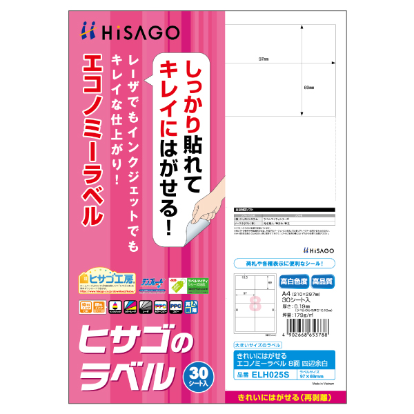 (まとめ買い)ヒサゴ きれいにはがせるエコノミーラベル A4 8面 四辺余白 30シート入 ELH025S 〔3冊セット〕 【北海道・沖縄・離島配送不可】