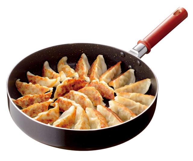 一般的なフライパンよりも焼き面が広いソテーパンです。大きすぎず小さすぎないサイズなので汎用性があり、普段使いに活躍します。同じサイズのフライパンでもチルド餃子の場合、6個多く焼くことができます。