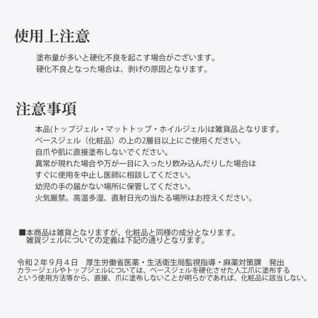 | 使用上注意 | ・本品(トップジェル・マットトップ・ホイルジェル)は雑貨品となります。