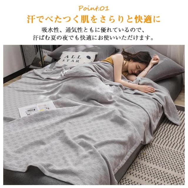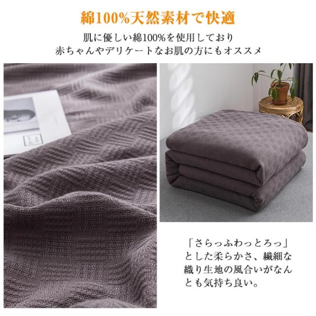 【吸水性の高い、綿100% 素材】吸水性、吸湿性の良い綿100%のガーゼなので、汗を良く吸い湿気をこもりにくくします。寝汗が気になる夏に嬉しい、さらりとした掛け心地の夏用ケットです。