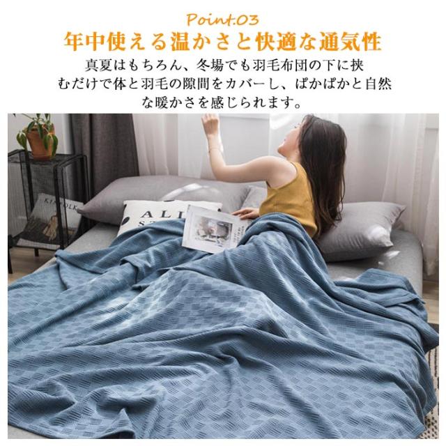 もちろん、赤ちゃんの肌掛けとしても最高です。 冬は掛け布団の間にかけていただくことで、蒸れにくく1年中快適にお使いいただけます。 軽くて薄いので場所も取らなく、一枚準備しておくと便利なアイテムです。